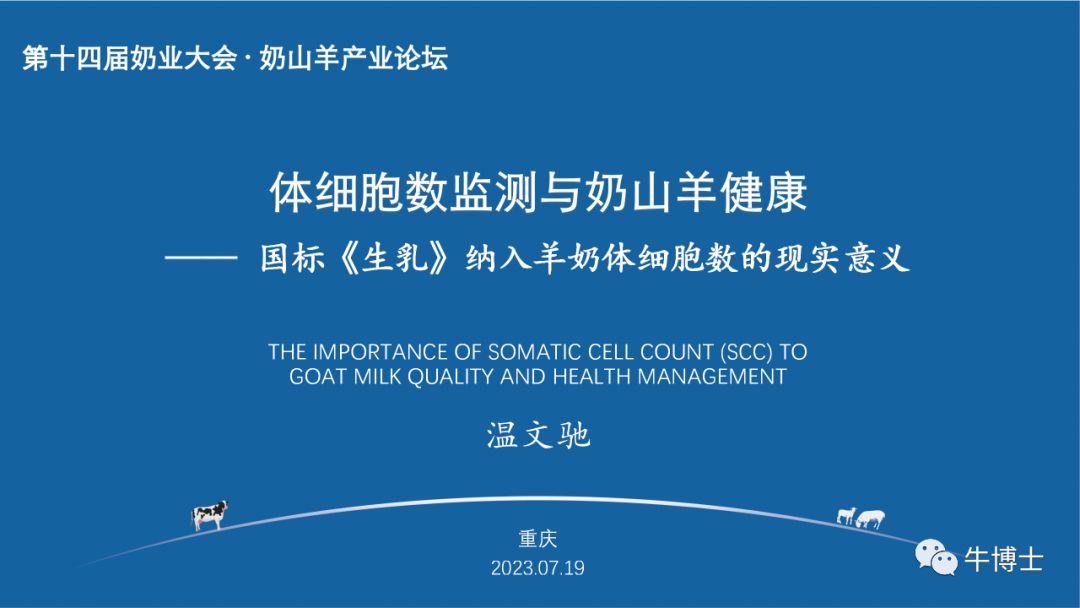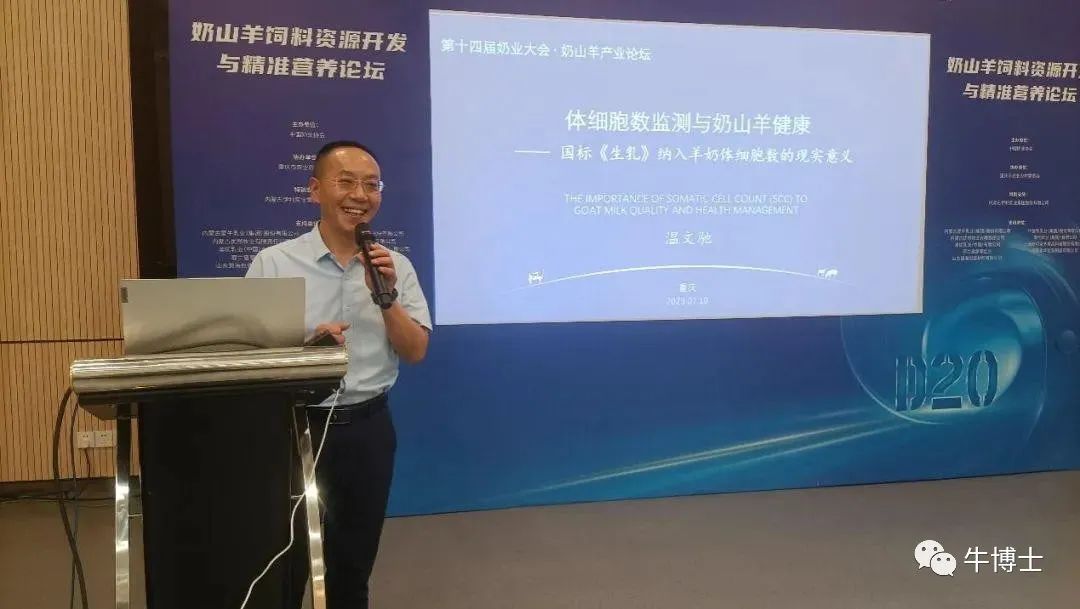 2023年7月19日,第十四届中国奶业大会在重庆国际博览中心成功举办,大会分论坛"奶山羊饲料资源开发与精准营养论坛"由中国奶业协会奶山羊专业委员会承办。百余位国内外专家学者、业内精英汇聚会场,就如何提高奶山羊饲料利用、推动奶山羊产业的进一步发展进行专题汇报与交流,牛博士受邀发表了“奶山羊健康与体细胞数检测和控制”的报告,并在奶山羊专业委员会与各位羊奶专家的见证下发布新品牌“羊博士”。