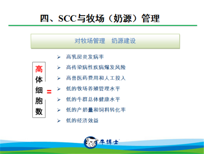 体细胞数是指每毫升牛奶中所含的体细胞的数量,体细胞数越低,生乳质量越高,相反,体细胞数越高,对生鲜乳的质量就产生很大影响,并会对生鲜乳的保质期和下游其他乳制品产生不利影响。