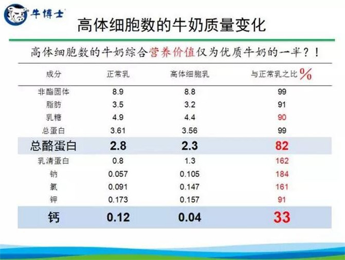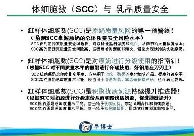 2、乳品质量安全是奶业振兴的“源代码”,体细胞数是原奶质量风险的“******预警线”,生乳国标纳入体细胞数对乳企和牧场都具有极其重要的意义。