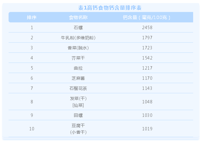 其实奶的钙含量并不高,例如山羊奶的含量为95毫克/100克,绵羊奶为230毫克/100克,牛奶为120毫克/100克,人奶更低只有30毫克/100克。事实上,如果与其他食物相比较,可以发现牛奶里的钙含量并不高,甚至连“较高”和“稍高”都算不上,所有哺乳动物的奶包括人乳,都无法与螺肉的钙含量相比较。它的钙含量高达2458毫克/100克,是牛奶中钙含量的20多倍,见下表1(表1高钙食物钙含量排序表)[食物营养成分网.食物营养成分表查询[EB/OL]. http://yingyang.00cha.com/.]。