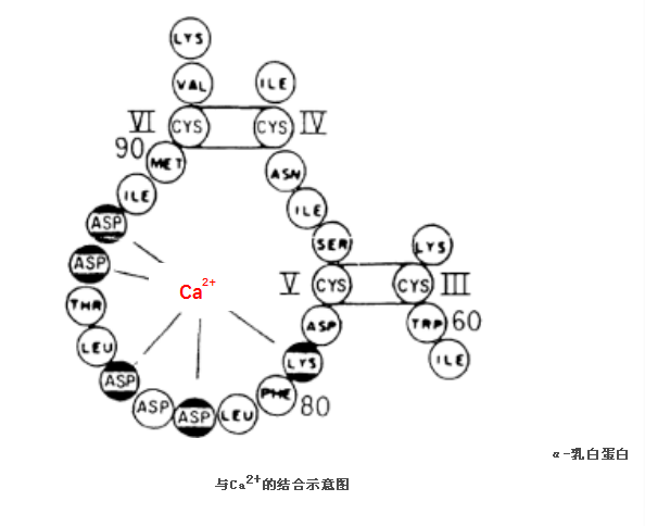 因此,补钙******牛奶及其制品是有科学依据的。之所以奶及奶制品能够实现******补钙,显然并非由于奶及奶制品中钙的含量比其它食物高。除了上述酪蛋白磷酸肽,乳清蛋白里的α-乳白蛋白也是一种典型的金属结合蛋白,对于正2价阳离子结合力强。它是由123个氨基酸构成,由于二级结构的螺旋、折叠等原因,其中四个天冬氨酸(Aps)残基处在非常特殊的位置,空间构象形成一个“口袋陷阱”。理论上每个“口袋陷阱”可以“攫取”一个钙离子,如“图 α-乳白蛋白与Ca2+的结合示意图”所示[P. F. Fox, T. Uniacke-Lowe,P. L. H. McSweeney, J. A. O’Mahony. Dairy chemistry and biochemistry(second edition)[M].Springer International Publishing Switzerland, 2015.] 。