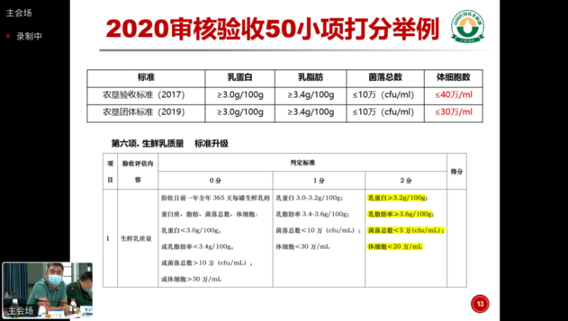 3、考核方式更加数据化,2020审核验收十大项中的每个小项均有相应的打分标准,用数据体现生鲜乳质量的标准升级和信息化管理与效益等一系列牧场指标。