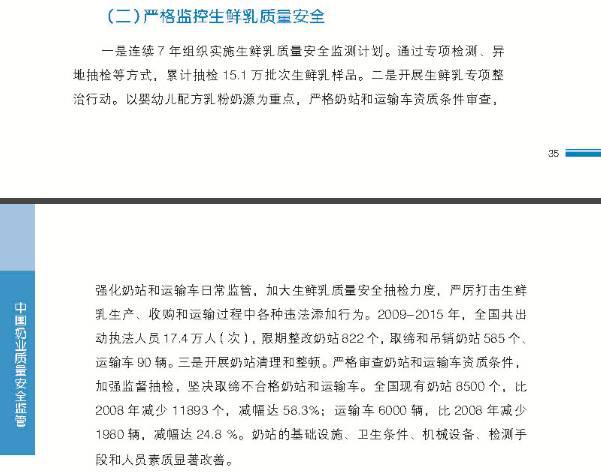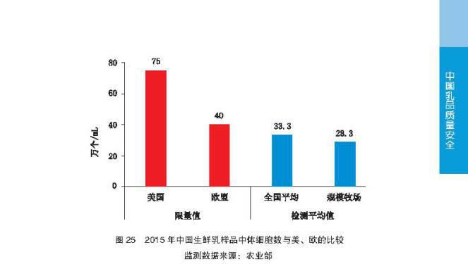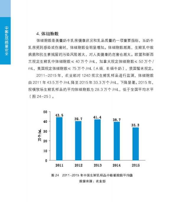 报告指出,在生鲜乳质量安全指标中,菌落总数、黄曲霉素M1、【体细胞数】是反映生鲜乳卫生状况的主要指标。农业部从2009年开始实施生鲜乳质量安全监测计划,检测指标就包括【体细胞数】。 从中国奶业整体情况来看,对牛奶体细胞数的检测的重视程度越来越高。报告调研显示,国内规模牧场的平均体细胞数已接近欧盟水平。