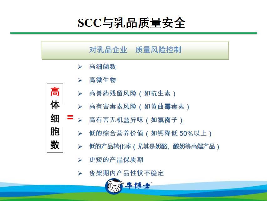 国际乳业通识, SCC越低,生乳质量越高;SCC越高,对生鲜乳的质量影响越大,并对生鲜乳的保质期和下游其它乳制品如酸奶、奶酪等的产量、质量、风味等产生极大的不利影响。因此被各国专家认为是生鲜乳质量标准中***重要的指标之一。