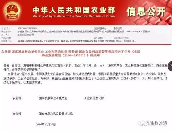 为促进奶业振兴发展,保障优质安全乳品有效供给,加快建设现代奶业,1月9日,由农业部、国家发改委、工信部、商务部、国家食品药品监督管理总局五部委联合印发了《 全国奶业发展规划(2016-2020 年)》,五部委联合发布“十三五”奶业规划,说明部门之间在很多关键问题、关键环节上都达成了一致,业内人士表示,本次规划为奶业指明了发展方向,奶企有望迎来新的发展机遇。