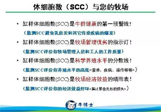 体细胞数是指每毫升牛奶中所含的体细胞的数量,体细胞数越低,生乳质量越高,相反,体细胞数越高,对生鲜乳的质量就产生很大影响,并会对生鲜乳的保质期和下游其他乳制品产生不利影响。
