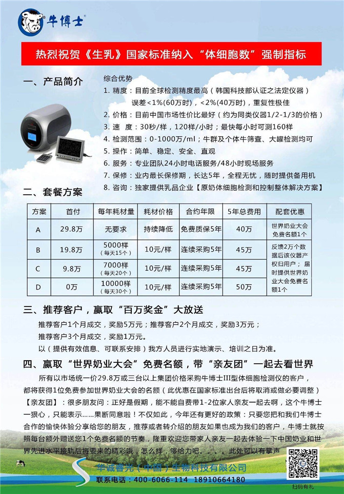 2、乳品质量安全是奶业振兴的“源代码”,体细胞数是原奶质量风险的“******预警线”,生乳国标纳入体细胞数对乳企和牧场都具有极其重要的意义。