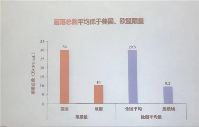 2018年规模养殖场体细胞监测数据为22.1万个/mL,显著低于美国75.0万个/mL、欧盟40.0万个/mL的标准;2018年规模养殖场******数监测数据为7.2万CFU/mL,显著低于美国30.0万CFU/mL、欧盟10.0万CFU/mL的标准;乳蛋白抽检平均值3.25g/100g,比2012年提高0.09g/100g,高出国家标准0.45g/100g;乳脂肪抽检平均值3.84g/100g,比2012年提高0.25g/100g,高出国家标准0.74g/100g;反映牛奶卫生状况的生鲜乳菌落总数为29.5万CFU/mL,比2013年降低了35.1万CFU/mL。
