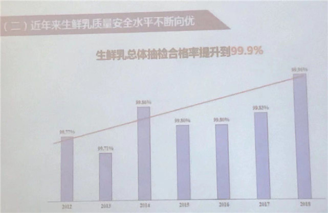 2018年,生鲜乳抽检合格率99.9%,同比提高0.1个百分比。三聚氰胺等违禁添加物抽检合格率连续多年保持在100%。